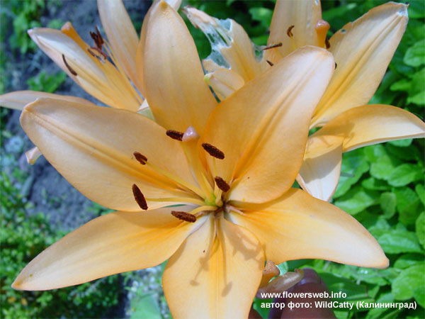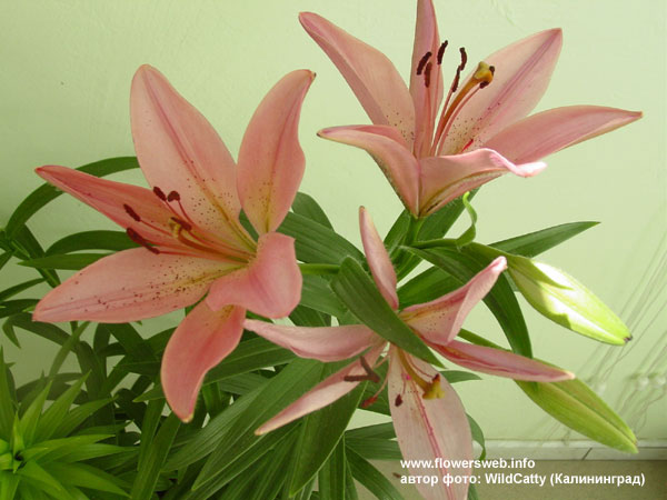 Прекрасная лилия - всегда воспринималась как цветок особенный, царский. Латинское название с древнего кельтского языка переводится как белизна. Род насчитывает около 100 видов, произрастающих в Европе, Азии и Северной Америке. Стебли прямые, густо облиственные, зеленые, темно-пурпуровые или с темно-коричневыми штрихами, высотой 30-250 см, толщиной 0,3-3 см. Листья линейные, ланцетные, линейно-ланцетные или продолговато-эллиптические, сидячие или черешковые, от 2-3 до 20 см длиной, расположены в очередном порядке, реже мутовчато. Цветки одиночные или собраны по 2-40 в пирамидальные или зонтиковидные соцветия. Околоцветник воронковидный или близкий к колокольчатому, чалмовидный или кубковидный, состоящий из шести долей. Окраска белая, красная, оранжевая, розовая, сиреневая или желтая, большей частью с крапинками, полосками или пятнышками на внутренней стороне листочков околоцветника. Срезанные цветы долго сохраняются в воде. Наиболее благоприятный климат для лилий - в Японии, где их разводят в больших количествах не только для украшения садов, но и для употребления туземцами в пищу. Лилии дают стебли, покрытые узкими, продолговатыми листьями и увенчанные несколькими очень крупными, иногда превосходно окрашенными цветами. Горшечная культура лилий несложна: начинается она ранней весной, так как большинство лилий вполне хорошо цветут только летом, на балконах, пользуясь обильным притоком чистого воздуха. Горшки должны иметь диаметр 15-20 см. Землю берут самую питательную, с примесью песка. При посадке необходимо принять во внимание замечательную особенность луковиц лилий: они отличаются от луковиц других растений тем, что дают из донца весьма незначительное количество корней, очень долговечных, но принимающих весьма мало участия в питании цветочного стебля. Последний получает из земли пищу почти исключительно при посредстве корней, вырастающих кольцами на нижней его части, т.е. выше луковицы. Эти корни менее долговечны и умирают вместе со стеблем. Следовательно, чтобы дать побегам возможность хорошо окорениться, луковицы необходимо посадить настолько глубоко, чтобы впоследствии нижняя часть стеблей находилась под землей. На водосточное отверстие горшка кладут черепок, после чего насыпают слой земли не более 4-5 см. На этот слой стаят луковицу, расправив наодящиеся при ней корни равномерно во все стороны. Затем добавляют столько земли, чтобы после умеренного обжатия луковица оказалась до половины засыпанной. При этом земля дойдет едва до половины высоты горшков. После этого горшки ставят на подоконник прохладной комнаты или светлой кладовой и держат умеренно влажно. С наступлением теплой погоды их переносят на балкон. Луковицы вскоре трогаются в рост и выгоняют сильные стебли. Когда стебли перерастут край горшка, в горшки подсыпают постепенно землю до такой высоты, чтобы в конце концов оставить только пространство, необходимое для поливки. При описанном способе посадки нижние части побегов будут находиться в земле, где беспрепятственно и разовьют многочисленные корни.
