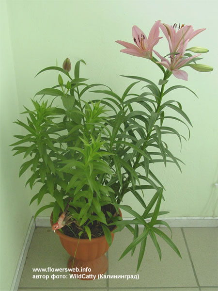 Основные требования лилии - простор и прохладные ночи. Луковицы осенью высаживают в горшок диаметром 15 см и прикрывают сверху слоем земли толщиной 4-5 см. Держат в прохладном темном месте во влажной почве. С появлением ростков переносят в хорошо освещаемое место. Для успешного роста лилий им летом необходимы солнечное положение на балконе, обильная поливка и жидкое удобрение, В пересадке нет никакой надобности. Когда начнут развиваться цветы, то стебли в большинстве случаев подвязывают к палочкам. По отцветании стебли начинают постепенно отмирать. Тогда постепенно уменьшают поливку, а затем вынимают луковицы из горшков, срезают стебли у самых луоквиц и сохраняют луковицы зимой в подвале, уложив их на слой умеренно влажного песка. Лилии не переносят вполне сухого зимнего содержания. Уход после цветения: по мере того, как листья начинают желтеть и стебли отмирать, полив уменьшают. Почву содержат в слегка влажном состоянии до осени, когда луковицу пересаживают.