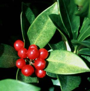 Известно около 12 видов этого мелкого кустарника. Весной - белые пахучие цветы, собранные в метелки, осенью - ярко-красные, долго не опадающие ягоды - таковы отичительные признаки этого восточно- азиатского растения. Оно родственно апельсиновому дереву и достигает 1 м в высоту. Листья блестящие, похожие на лавровые. Скиммия японская - S. japonica. В зонах мягкого климата выдерживает даже минусовую температуру, относится к растениям, возделываемым в больших переносных емкостях, что следует учитывать при разведении этих растений в помещении.
