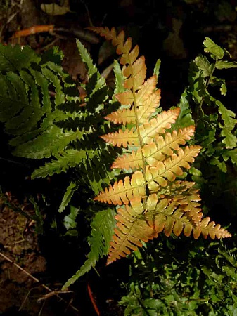 очень красивый папоротник. Иногда продается как садовый. Я пробовал высаживать в открытый грунт, но после нескольких успешных зимовок в эту зиму он замерз. В оранжерее растет очень хорошо. Достигает высоты до 50 см. Молодые вайи покрыты розовыми чешуйками, отчего имеют крайне ораганильный облик. Темные глянцевые листья шикарны. А молодые листовые пластинки бронзового цвета.
