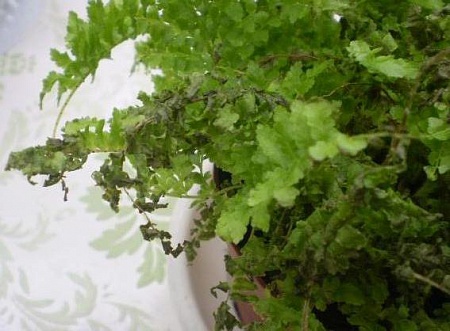 Помоему я поняла свою ошибку. Когда я принесла его домой я его сполоснула из душа. А папоротники надо брызгать только отстоянной водичкой.