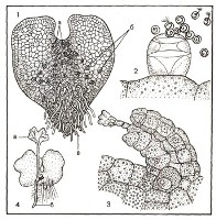 Половое размножение папоротника: 1 — заросток, а — архегонии, б — антеридии, в — ризоиды; 2 — из зрелого антеридия выходят сперматозоиды; 3 — архегонии, готовый к оплодотворению; 4 — заросток с молодым спороцоном, а — первый лист, б — корешок