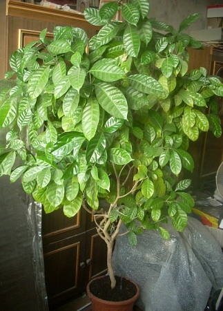 Cпасибо! Она у меня года 4, покупал на ВДНХ, растение 30 см. На заднем плане, на фото, шкаф он 192 см, так что с горшком она повыше получается, горшок 15 л. На юго-западном окне (на подставке от пола) Вообще растение неприхотливое на мой взгляд, каких то капризов не наблюдал, грунт обычный: торф, песок, перлит, немного старой очень мелкорезаной коры и сухих листьев. Сейчас внутри кроны стали появляться желтеющие листья, думаю от недостатка света, буду вешать лампу, да и наклоняется оно к свету. Грунт просыхает быстро, поэтому полив частый по мере просыхания. Цветет хорошо, большинство цветов раскрывается не полностью, ну это у многих так.