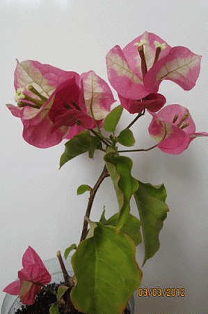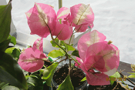 Анаташа, спасибо! это эксперимент холодной зимовки или я это называла бы "стимуляция холодом" Расскажу свою историю бугомании. Весной (март-май) прошлого года обострился спортивный интерес к укоренению бугенвиллий. До этого видела их только на картинках. Набрала разных черов. Укореняла в тепличках: сначала в воде с коренвином до образования белых точек, потом в земле. В качестве подогрева использовала теплый пол и солнце из окна. 100% укоренились Chitra, Double Pink, Magic, Juanita Hatten, персиковая. Частично Turkish Delight и San Diego Red Variegata Самыми капризными у меня оказались Panda и Douphine. Double Pink, Magic, Juanita Hatten, персиковая зацвели уже в июле Радости не было предела До конца сентября буги жили на даче, к тому времени уже значительно похолодало. Часть переехала в дом на первый этаж в отапливаемое помещение, другая на второй этаж, который не топится. Те кто приехал в тепло начали набирать бутоны, но цветение в октябре-декабре на подоконнике, хоть и южного окна, было очень бледное и скудное, и конечно буги кидались бутонами В конце января у нас начались сильные морозы, побоялась, что буги, стоящие на втором этаже, померзнут, принесла их в тепло. Постояли, подумали и тоже начали набирать бутоны и цвести.