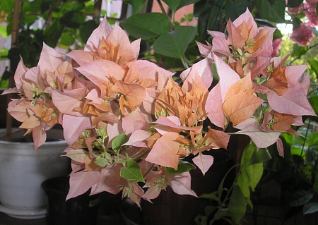 Зацветает сорт, полученный как Singapore Pink, прицветники открываются очень широко, молоденькие беловатые, взрослые набирают цвет и не выгорают до конца цветения, соцветия рыхловатые (второе цветение, буге меньше двух лет)