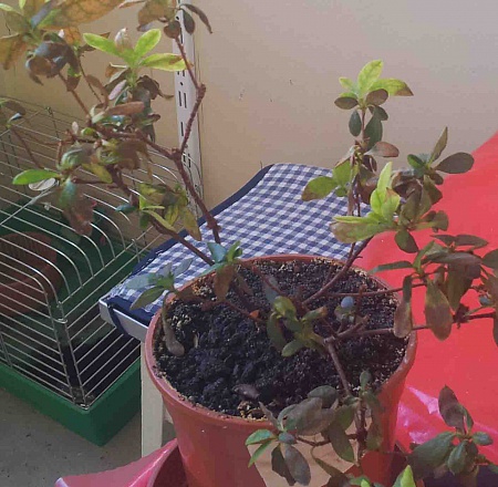 Девочки помогите моей азалии !!! Я новенькая в этом . Мне отдали азалию не в лучшем состоянии но я хочу ее восстановит. Вот ее фото скажите что с ней и что мне делать??? и она даже сейчас стараеться цвести