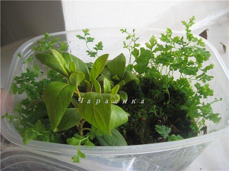 Я то удивилась, в конце марта черенки воткнула, закрыла и забыла. А тут случайно взгляд упал на баночку и вижу что-то там торчит лишнее, открыла-поганка. А кудрявенькое... это наверное мох какой-то.