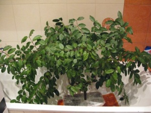 Но на самом деле оказалось, что мирт угнетала... щитовка! Можете себе представить - щитовка на мирте?! Я эту мерзавку чисто случайно разглядела, она слилась со стволом, и сразу ее очень трудно было заметить. После того, как я щитовку протравила и подстригрла мирт, он стал выглядеть так: