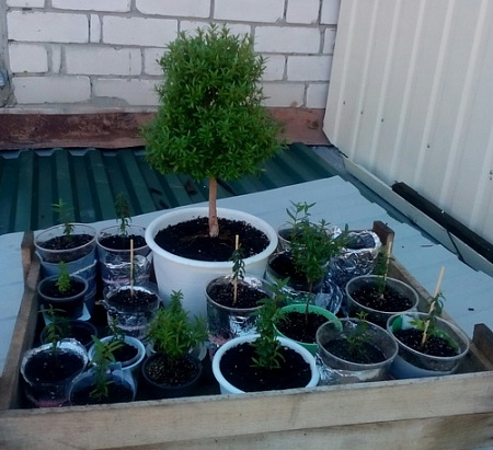 С последнего цветения собрала ягоды, причем зеленые, достала семена, продержала их в пакетике в шкафу больше года и в этом году посеяла. Сейчас сеянцы уже кустятся, но размером они меньше, чем были сеянцы из покупных семян. Сейчас мой любимчик стоит вместе со своими черенками на крыше гаража. Солнце светит с 15,30 до заката. После обрезки мирт уже прилично оброс. Как обрезала, фото не сделала, так как пребывала в состоянии шока от проделанного. Ой, забыла! За 2 недели до обрезки кроны я делала перевалку и лишние корни обрезала. Корни ему режу ежегодно. Прошлая обрезка корней была в ноябре 2015 года. Сажаю в тот же горшок. В этот раз посадила в горшок побольше, чтобы мирт разогнался и за лето вымахал с меня ростом. Ну, или почти с меня. На фото маленькие мирты - это сеянцы с большого деревца. Один из черенков я высадила в сад в открытый грунт. Хочу сравнить, как мирт развивается в маленьком горшке на улице, в большом горшке и в открытом грунте. Зимует мой мирт на подоконнике, но подоконник широкий. Горшок я ставлю в плошку для кошек, в которую насыпаю керамзит и заливаю его водой. Штору поднимаю на подоконник, закрывая ею цветок от жара батареи. В течении дня несколько раз проветриваю комнату "до мурашек по коже". Цветок во время проветривания с окна убираю. Подсветки никакой не было, но мирт стоит на южном окне и солнце зимой яркое. Теперь купила фитолампу. Проверю, как на нее реагировать будет. Еще планирую сделать экран из поликарбоната в виде буквы "П", чтобы закрыть подоконник от батареи. Для любования и ухода за цветами буду просто его снимать с подоконника.