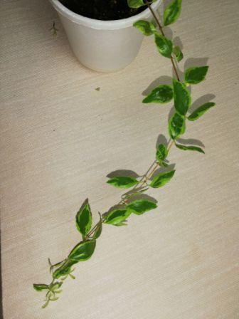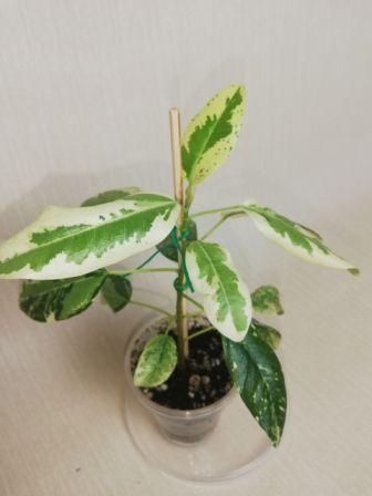 = 1500 Молодое растение , зеленый побег от вариегатного, молодые листья с вариегатностью, потом темнеют. Если обрезать до "вилки" возможно даст вариегатные листья. Растет в 500 гр стакане, надо пересаживать