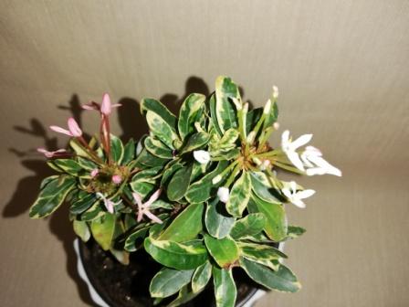 Ixora sp.(T02) albomarginata (white flower) , фото 1 - цветение по сорту, иногда выдает цветение, как на фото 2 ( в стадии роспуска) - и розовые и белые цветы на одном растении. Но в основном цветет по сорту.