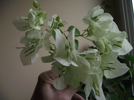 9. Бугенвиллия Apple Blossom - по 100 р. № 5 в 400-г стакане и № 6 в 200-г стакане с двумя черенками. Прицветники белые, на некоторых розово-фиолетовые пятна. Очень красивый сорт. Неприхотлив. У меня живет и цветет на северной лоджии. Фото цветения мамки прилагаю.