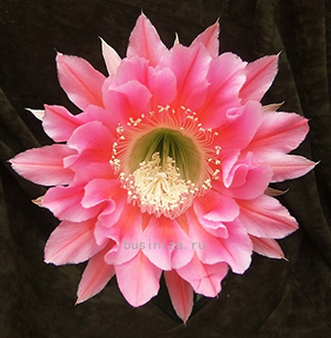 Эхинопсис шаровидной формы. 3 круга лепестков. Большой цветок 11 см в диаметре. Цветочная трубка 18 см. Овальные лепестки белого цвета, внешний ряд розового цвета. На кончиках лепестков выемки. Слабый, цветочный аромат болотных растений. Продаются детки с корнями 2,5 х 2,5 см - 450 р