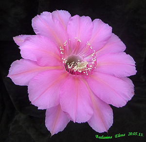 Родители: Ech. hybr x Echinopsis Terpsichore. Детки с сеянца, выращенного мною. Материнское растение шаровидной формы с выраженными длинными колючками, тёмно-зеленого цвета. Зацветает в середине лета прекрасными цветами. Лепестки по краям бледно-розового цвета, в середине яркая розово-оранжевая стрелка. Внешний круг длинные, закручивающиеся лепестки пастельного цвета. Аромат средней силы, приятный. Продаётся не укоренённая детка с зачаточными корнями