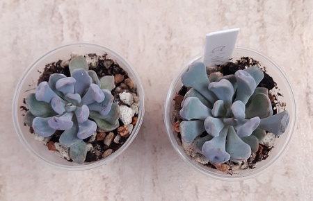 Galinka47 написал: 28. Echeveria Trumpet Pinky, 4 см, по 200р.- в горшочке справа которая