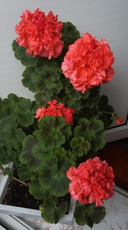 Пеларгония Dagmar Murray (крупные яркие оранжевые соцветия, декоративная листва с фестончатым краем и тёмной зоной, хорошо зимует без подсветки)