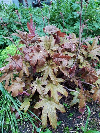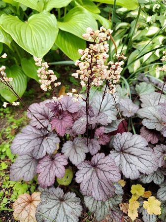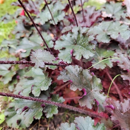 Purple Petticoats (осталось 3 шт по 150р) (в переводе «фиолетовые юбки») – очень курчавый сорт гейхеры высотой около 30 см. На одном кустике листва с гофрированными краями разных оттенков – от зеленовато-фиолетового у взрослых листьев до пурпурно-красного у молодых листочков. На полном солнце цвет становится ярким свекольно-красным. Куст очень плотный. Цветы кремовые на очень длинных и прочных цветоносах. Отлично переносит полное солнце, полутень.