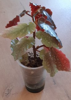 Бегония - Begonia dainty spray sport (спорт) - 200. Не маленький черенок, растёт немного ампелем, сложно снять. На одном листике есть что-то вроде вариегатности. Молодые листики красные.
