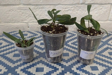 Черенки в стаканах 200 мл, 2500-3500-4000, средний и правый- с бутонами. Правый- с несколькими проснувшимися боковыми ростами: