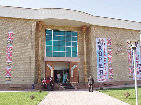 Вход оформлен в традициооном узбекском стиле - деревянные резные колонны из пирамидального тополя и резная дверь
