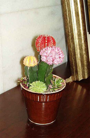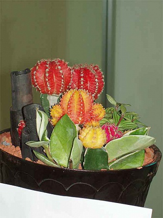 Были безхлорофильные кактусы. Для меня это загадка - что они живут на чужих корнях понятно, но где или как такие цветные кактусовые шапочки берут?