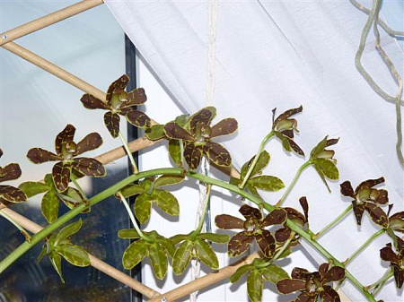 Поделюсь своим скудным опытом. Грамм был куплен в апреле прошлого года "неопознанным" (ботва понравилась и подвес ) в славном Тае. был помещен на окно западной ориентации недалеко от форточки. А далее уход не отличался от других видов (у меня с этим строго... все под одну гребенку ). Полив раз в неделю теплым душем. Подкормка раз в две недели спец удобрением для орх. Спустя год (примерно в мае этого) порадовал меня цветочной стрелкой. Фото прилагаю. Да... чуть не забыла... перепады обеспечивались только на момент недолгого открывания окон на проветривание и в летний период (даже не выносила на балкон к остальным по причине несоответствия габаритов ... уж больно крупненькое дитя) Да... и еще.. цвел долго. От момента роспуска первого цветка до увядания последнего прошло два месяца. И это вопреки всем моим стараниям загубить процесс вообще (я не специально ... просто жила на даче большую часть времени и приезжала раз в неделю полить). Полагаю, при более усердном поливе цветение продлилось бы примерно на месяц.