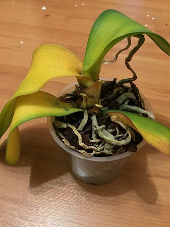 Здравствуйте. Купила фаленопсис около двух месяцев назад. Он отцвел, цветонос обрезала и присыпала место среза угольком. Уезжала из дома на четыре дня, перед отъездом полила цветы, когда вернулась, то застала свою красавицу в плачевном состоянии: листья пожелтели и отпадают, в районе роста листиков какие-то темные пятна, но корни вроде бы целые. Субстрат и горшок остались те, в которых она продавалась. Я не стала пересаживать, т.к. орхидея цвела. Поливаю её не чаще раза в неделю (предварительно проверяя высох ли субстрат) методом погружения на 15-20 минут. Листики брызгала водичкой. Помогите определить, что это за болезнь и можно ли спасти мой цветочек, и как его лечить???
