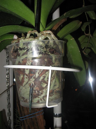 Добрый день! Купила отличный фаленопсис. С цветоносами. Но вот не знаю, что делать с корнями. Два длинных корня проросли внизу горшка через дренажные отверстия. Подскажите, нужно ли что-то с ними делать? [IMG][/IMG]
