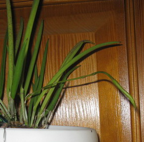 Размеры горшка: горшок квадратный, слегка расширяющийся вверху. Дно горшка - квадрат 25 х 25 см, верх горшка - квадрат 35 х 35 см, высота горшка - 30 см. Высота растения от ризомы до верха листьев - 60-62 см. Это еще пока цветоносы не выросли. В прошлом году цветоносы были по метру. Не знаю, как в этом году будет - все-таки их на 10 штук больше, хватит ли у растения силы на 14 метровых цветоносов?