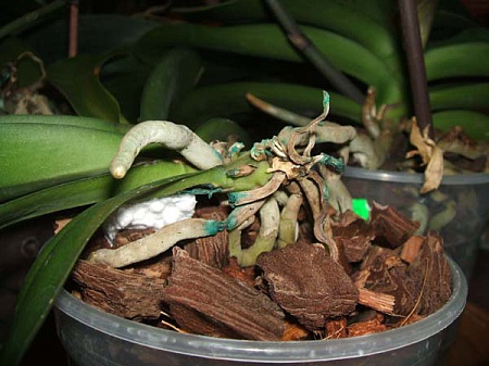 Джил, я бы пересадила Ваш фалик, заодно посмотрела бы, что на самом деле с корнями. Налет на корнях может быть от солей - это не страшно. А вот пустые и сгнившие надо обрезать, срез обработать - уголь, корица, зеленка - на выбор. Я свои сажаю в чистую кору, если есть добавляю кусочки угля от костра. Кора в которую сажаю чуть влажная. Т.е провариваю, подсушиваю пару дней или в духовке если надо быстро. Можно и в сухую, только тогда первое время надо будет чаще поливать- пересохшая кора очень плохо впитывает влагу. После посадки не поливать дней 5, что бы все ранки подсохли. Если корней останеться мало, палочкой или 2-мя подоприте фалик в горшке, что бы не шатался. Я такого бедолагу подвязавала к палочке за старый цветонос. Я думаю все будет хорошо.