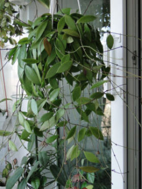 Расцвела Hoya Gracilis. К сожалению случайно заметила когда поливала цветок. Хорошую фотографию нет возможности сделать, т.к. эта хойя разделяет горшок с лакунозой и в длинну все плети чуть больше метра. А расположен горшок под потолком.