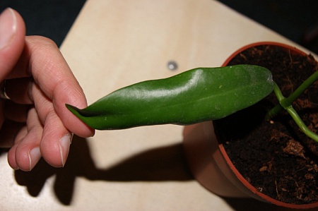 bab, может, не стоит пока паниковать? У хой часто на одном растении бывают слегка разные листья. Подождите, когда подрастет, тогда и присмотритесь еще раз.