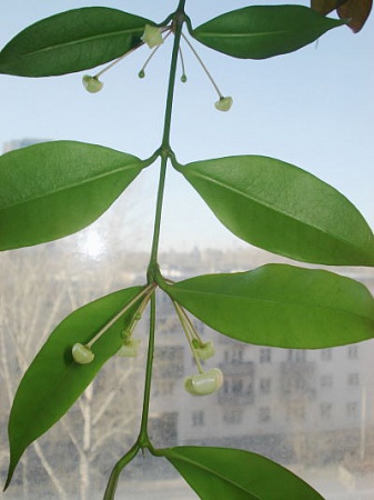 Я свою не прищипываю, но обрезаю и укореняю рядышком, а вообще моя хойка дала новый побег из-под земли (на фото он самый молоденький), да и боковые отростки дает. Приобрела я неукор. черенок с двумя листочками летом 2005, а так она выглядит сейчас: