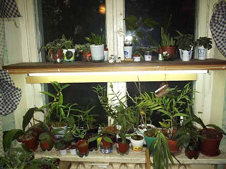 Начну с того, что просто не переношу нагромождения на окнах, но количество растений перешло все допустимые границы. После летнего отдыха на застеклённой лоджии, встал остро вопрос о размещении растюх в квартире. Фиалки вернулись на стеллажи. Крупные, заматеревшие фикусы, олеандр, монстера, хойя были без особых сожалений отправлены в мужнин офис. Ампели разместились в кашпо на стены. Дошла очередь до орхидей. И вот тут-то я схватилась двумя руками за голову: из-за моей неосмотрительности их поголовье увеличилось раза в два (нужно учесть, что это - не предел). После нескольких дней раздумья, пришла к выводу, что как минимум, одно окно придётся всё—таки загородить. Хочу заметить, что рамы на окнах достались нам от бабушки. Стеклопакеты пока в наши планы не входят, поэтому все окна занавешены, как минимум, тюлем. Пошла рыться по форуму, в надежде найти подходящий для меня вариант полок или распорок на окно. Сначала просмотрела . Но полки с подходящими размерами так и не обнаружилось. Да и сама конструкция была мне не по душе. И ещё один немаловажный момент - кроме увеличения площади хотелось эту площадь досветить. Очень понравилась , опять -же полезная площадь -только подоконник, ширина которого у меня 18 см. За идеей зашла сюда. Покажу что получилось.