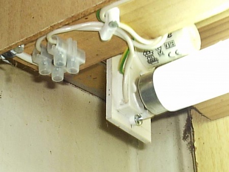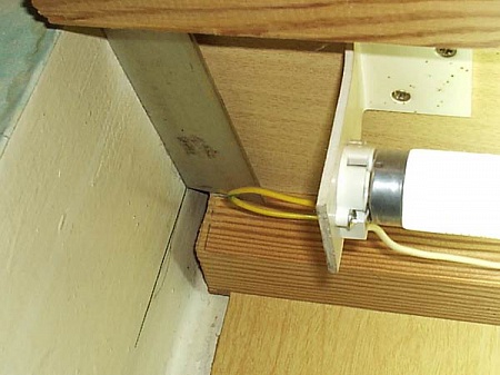 Сами установочные под лампы (те, куда лампы вставлены) крепятся к пластиковому уголку - муж его сделал сам, но, наверно, можно что-нибудь такое купить. В установочных есть место для проводков - вот на этой фотке лучше видно.