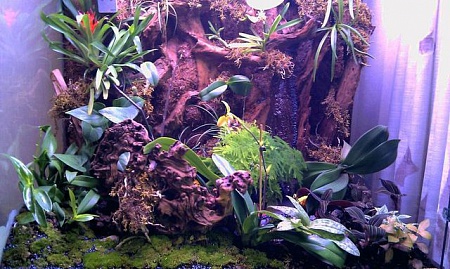 Спасибо, очень красиво. Если честно, меня больше интересует внешний вид и техническое оснащение. На самом деле я планирую строить влажный террариум вертикального плана для содержания оофаг пумилио. Просто чтобы долго не объяснять, что требуется, условия внутри должны соответствовать требованиям для орхидариума. А именно: 1. Влажность 70-100%. Дождевальная система с помощью помп высокого давления. Туманообразующая установка. 2. Система принудительной циркуляции воздуха внутри банки с помощью кулеров. Отсутствие "мертвых" зон. 3. Освещение предусматривает наличие ламп UVB. Ночная подсветка. 4. Практически полный (минимальный) воздухообмен с внешним миром. Тем не менее требуется вентиляция смотрового стекла. 5. Отсутствие щелей, полостей и т.п., через которые могут сбежать кормовые насекомые (дрозофилы, сверчки).