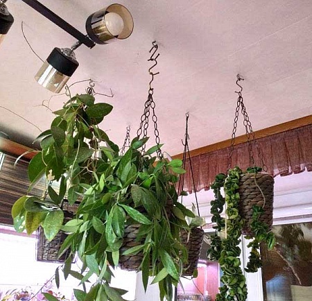 Так прямо и протянут через всю комнату. У нас квартира угловая, свет с двух сторон, хотя, конечно, это не самый лучший вариант. Но места катастрофически не хватает для растений. И рамы у нас старые деревянные - пластик не будешь дырявить, а у меня еще и рамы все в крюках.
