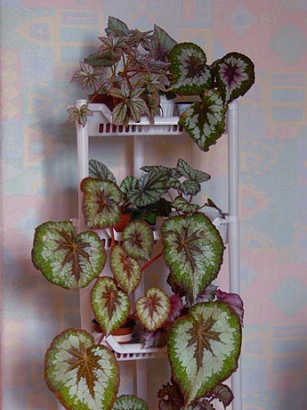 Летом у меня не хватило места для бегоний, и я приспособила полочку для ванной, все это стоит у прозрачной сены балкона в детской комнате, но сфоткать на местности не получается, бликует, поэтому только у стены