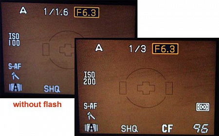 Результат без вспышки. Как и следовало ожидать при изменении чувствительности "пленки" выдержка меняется. Она прыгает с 1/2 до 1/1.6 (на снимке видны обе цифры, поскольку выдержка второй камеры была большой и она сфотографировала оба значения) - понятно, поскольку освещение очень слабое и погрешность измерения ее встроенным экспонометром велика (надо было больше диафрагму выставить). Для чувствительности в 200 выдержка в два раза меньше