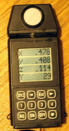 Для того, чтобы закончить разговор об измерении и ошибках. Мы притащили коробки из коробкохранилища и я там нашел фотометр. Померил освещенность в тех же условиях, что и мои измерения камерой на предыдущей странице. От двух лампочек освещенность камерой была 25 Лк, теоретическая - около 30. ФОтометр дал 29 Лк (Значение Y внизу. Верхние x-y-z - цветовые координаты и к делу не относятся). Мерять на улице пока не было возможности, поскольку батарейка для фотометра была украдена от датчика дыма на потолке - а они умные теперь и начинают мерзко орать, когда там нет батарейки (причем отключить его нельзя - начнут орать в других комнатах). Короче опыт пришлось прекратить. КОгда будут деньги на покупку батарейки, то повторю опыт на улице