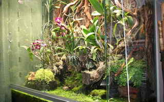 Зашел с вопросом сюда. Но заодно покажу творение. Схожее с Олеговым. Это скорее вивариум, чем флорариум. Аквариум+палюдариум+орхидариум. Описывал частично на палюдариуме.