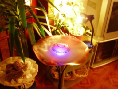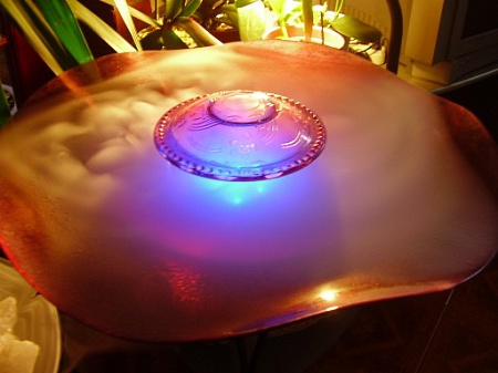 У меня тоже такая штучка есть, толкьо без "украшательств", Это ультразвуковой туманообразователь, просто тут он еще в стекле и тп. Кстати, весьма хорошо подымает влажность, вот только я его использовал с маломощным вентилятором, что б немного обеспечить циркуляцию тумана
