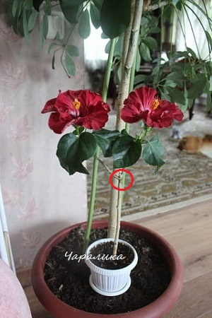 Это моя самая первая прививка, поэтому делала её сверху, там где потоньше стволик, чтобы диаметры совпали. Место прививочки пометила на фото. И название любимчика подписАла, я думала что любители гибискусов всё знают. Именно от этого растения у вас мой черенок.