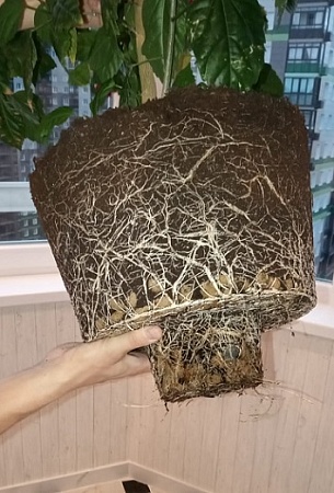 Гибискус достался около 1-1,5 лет назад маленьким, очень редким и с неудачно обломанной верхушкой (потому такая ассиметрия). Пересадил в чуть больший горшок с дренажными отверстиями, немного керамзита на дно, универсальный грунт, в середину цветок (ком с корнями не трогал), по бокам новый грунт (сбоку по 2 см).
