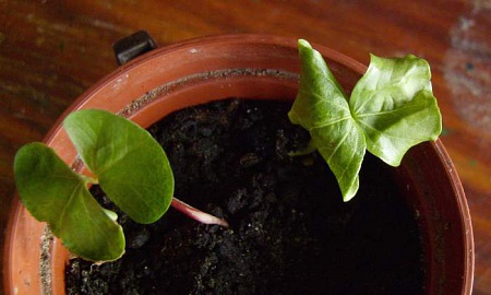 Счастлива известить читателей этой темы, что через почти месяц одно семечко теспезии все-таки проросло! На фото слева - хлопок, справа теспезия. Диам. горшка 8.5см. Т.е. семядольные листья не мелкие, этак сантиметр с лишним. Немного на солнце скукожились.