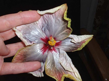 размер не измеряла, но больше 17 см, т.к. Лиза столько, рядышком стояла, этот заметно больше. Расцветка обалденная: на сайте поставщика нет совсем оранжевого перехода между серо-голубым и желтым, а на самом деле, он есть и полоса очень широкая, отчего весь цветочек выглядит красочным, уж совсем не бледным.