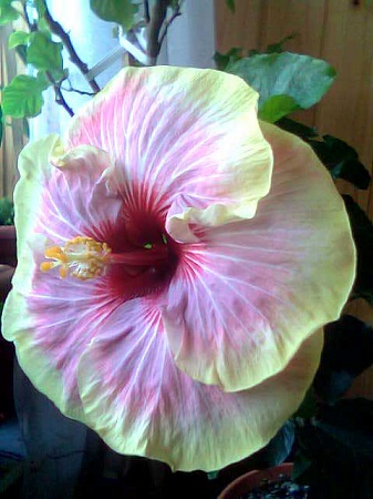 А на следующий день была долгожданная Tarantella, по величине бутона сразу было ясно, что цветочек будет не из маленьких , но 22 см я не ожидала . На сегодняшний день это самый крупный цветочек у моих гибискусов , и расцветка у нее классная, пастельная розово-малиновая, смотрится одновременно и ярко, и нежно