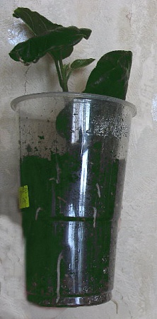 При посадке грунт слегка увлажняю тем же раствором циркона, в котором замачивались черенки. Далее стараюсь максимально редко тревожить тепличку. Открываю ее только для полива (в вазе и в бутылке необходимость полива определяю на глаз, как правило не чаще 1 раза в 2 недели (т.к. туда воздух практически не попадает, испарения практически нет). В тепличке растения приходится поливать чаще (раз в полторы недели), т.к. частенько крышка сдвигается и доступ воздуха туда (из-за неплотного прилегания крышек друг к другу) практически постоянный. Поливаю кипяченой водой не более, чем по столовой ложке под каждый. Прозрачные стаканчики позволяют без вреда для черенка увидеть корешки.