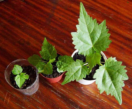 Похоже, чем карликовей сорт, тем он туже растет. На моей фотке крайний справа Бельвю на пару недель моложе среднего сомоопыленца беллы, которому месяца два. А разница в росте - раза в два. Слева - примерно месячная беллка НК-шная. У меня они взошли не хуже других (6 из 20). Возможно имеет смысл оставшиеся семена (непроросшие) поместить на балкон в горшке - может, еще что-то прорастет позже. Наверняка бывают упрямые семена, которым пойдут на пользу перепады температур. А ваши акварельки, если судить по листьям, не будут особо мелкими. Все-таки самые мелкие абутилоны - беллы, а у них листья не особо зубчатые. Мои акварелевские изабеллки пока только первый лист из семядольных гонят - трудно судить, что выйдет