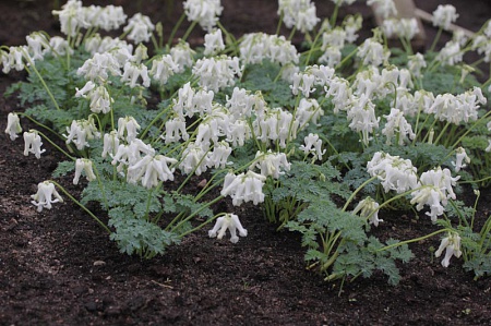 Исключительно долгоцветущий гибрид с ветками поникающих сердцевидных белых цветков. Крепкий компактный куст, листва голубовато-зеленая.